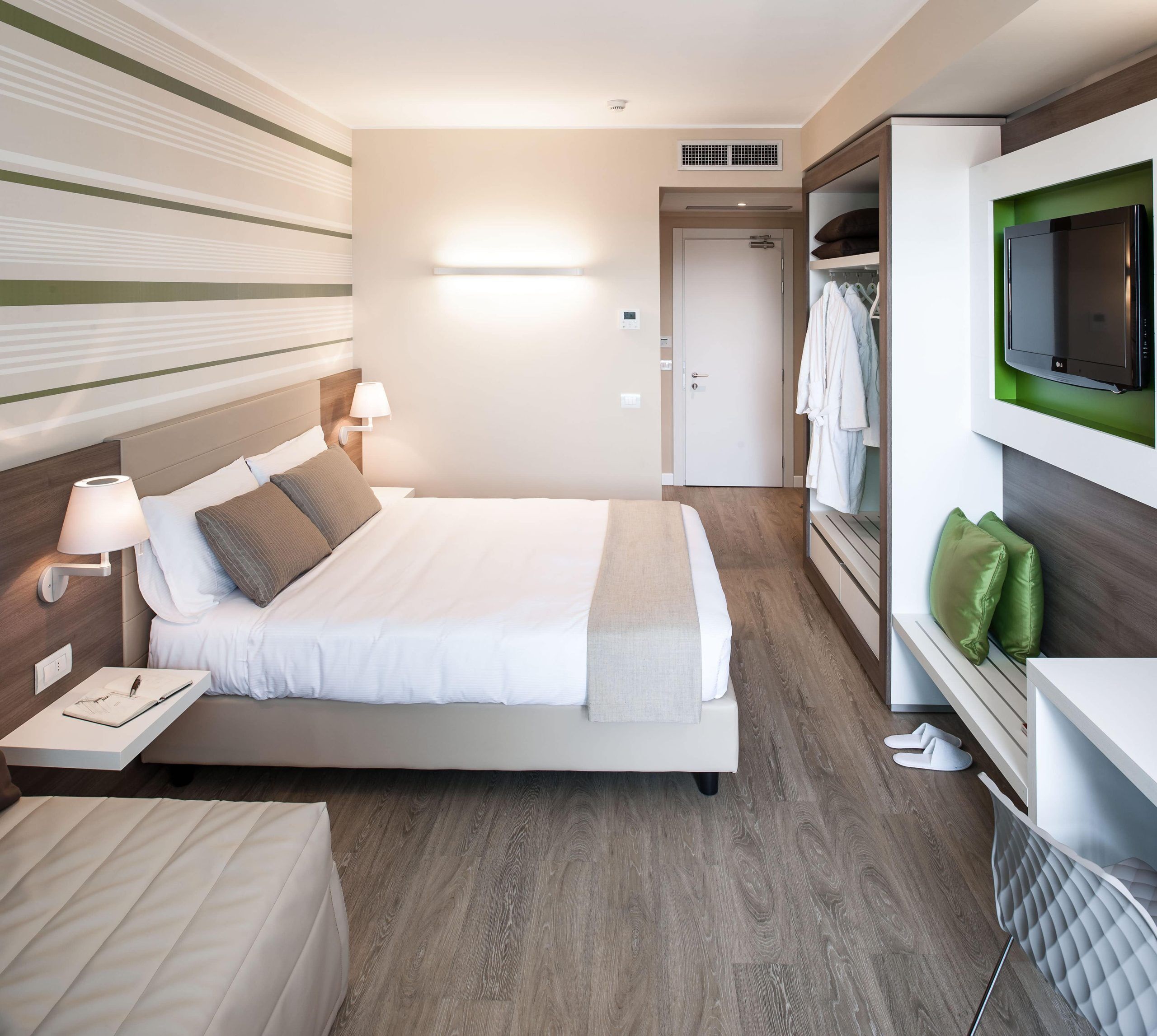 With view on the garden or pool of the hotel, Enjoy is the largest of our rooms, equipped with additional services and pluses that it is difficult not to fall in love with. It is perfect for those who love the elegance and refined style of Italian design, for those looking for a simple and romantic solution at the same time and to make their holiday really sweet. By booking this room our tasty breakfast is included in the price.